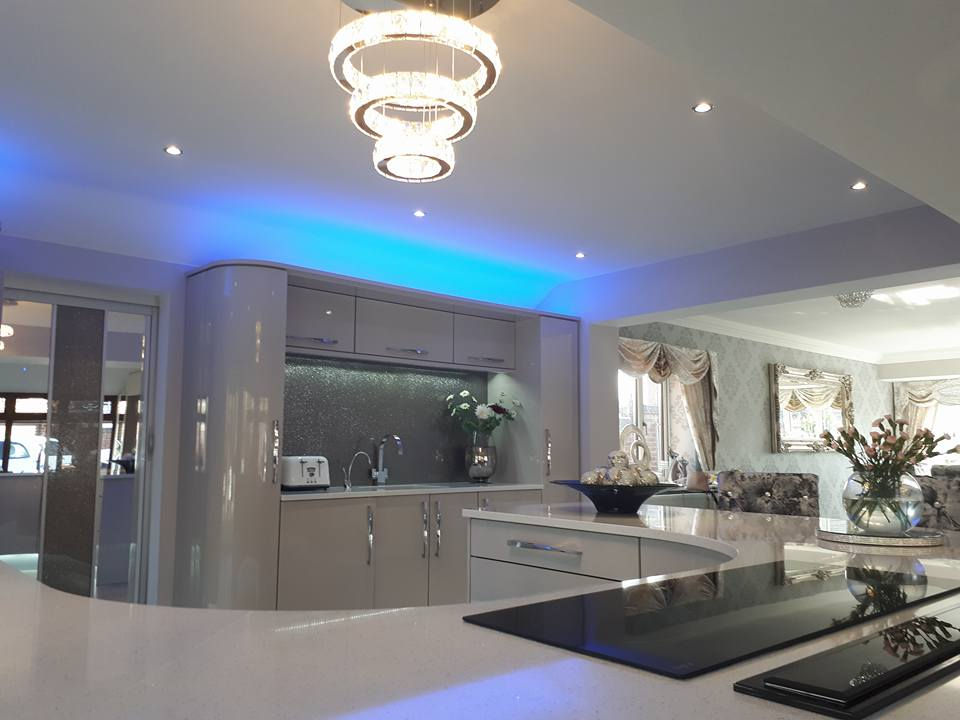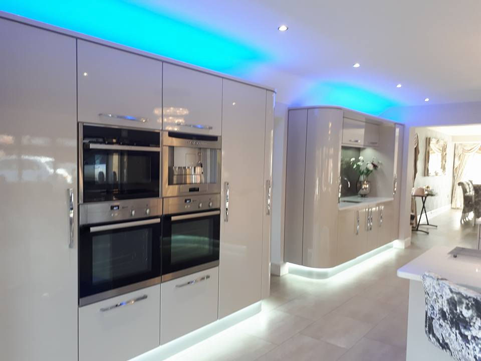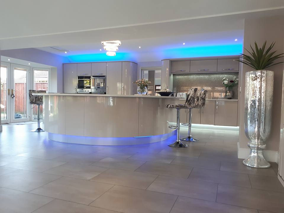 This is the most sparkly kitchen we have designed to date, high gloss horse shoe shaped island in cashmere with quartz worktops matching soft close cabinets and the most sparkly splashback I have ever sourced, we even made the sliding pocket door to match along with the TV surround furniture in this open plan area. All the customers wishlist was granted.